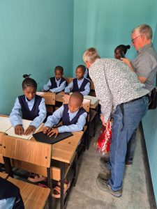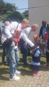 Bij de school worden we welkom geheten door zingende kinderen en de andere personeelsleden en boardmembers van de Solon-school — een warme ontvangst die diepe indruk maakt.