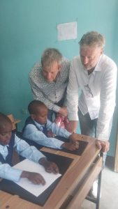 We kijken bij de kinderen, die bezig zijn met schrijven en lezen van braille onder de bezielende leiding van de leerkrachten, die zelf ook visueel gehandicapt zijn. Het ziet er prima uit.